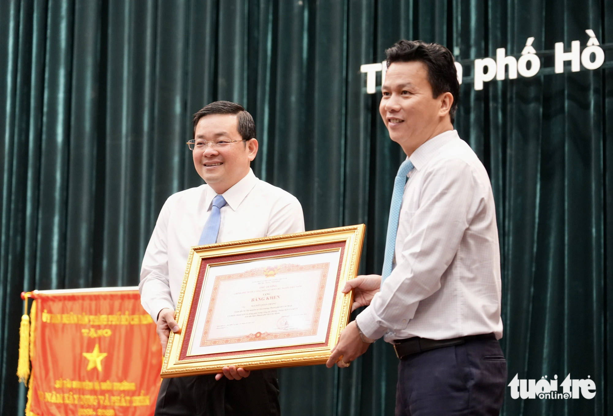 Dịp này, Bộ trưởng Bộ Tài nguyên và Môi trường Đặng Quốc Khánh trao bằng khen của Thủ tướng Chính phủ cho giám đốc Sở Tài nguyên và Môi trường TP.HCM Nguyễn Toàn Thắng.