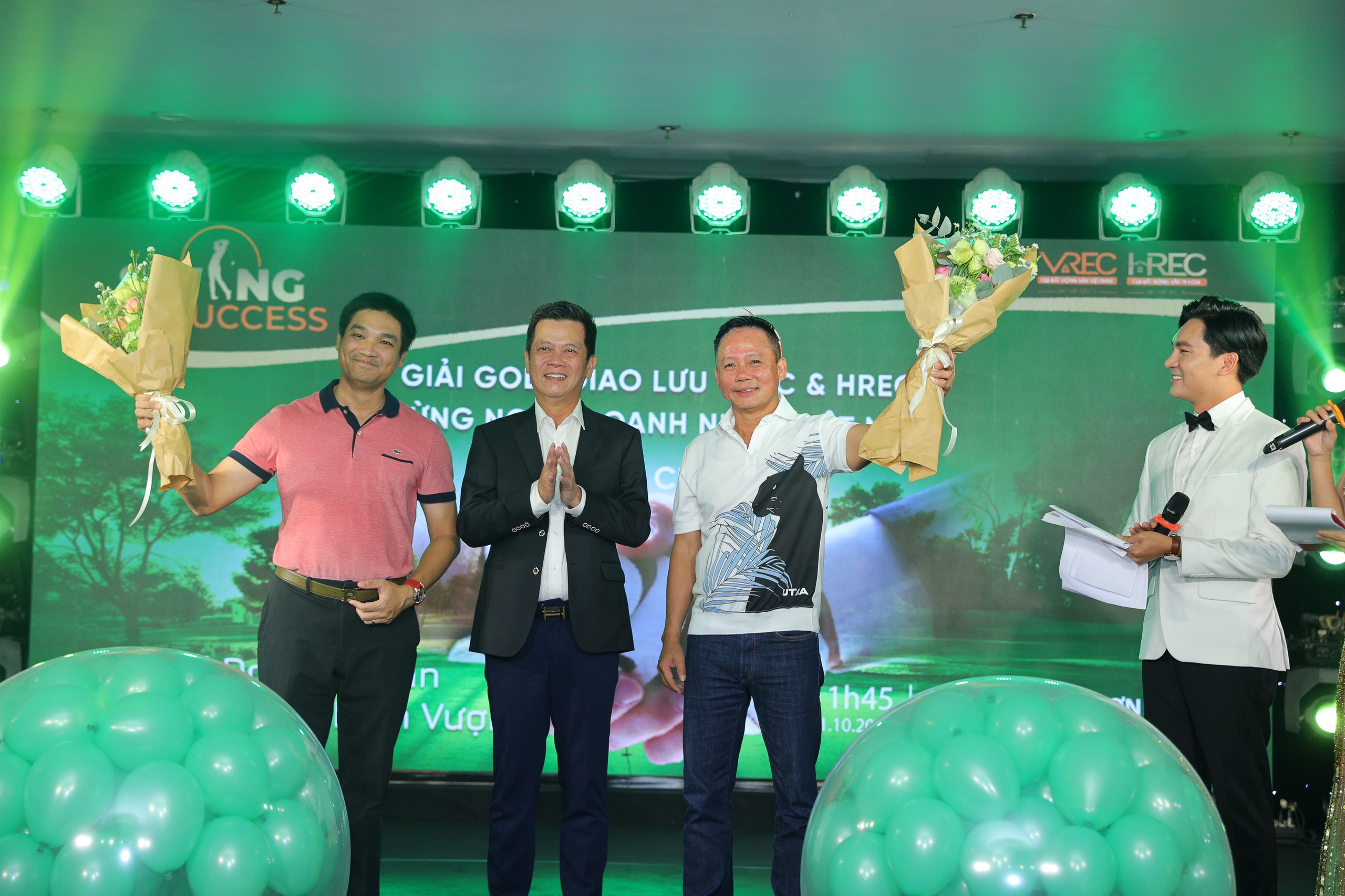 Ông Nguyễn Quốc Bảo - Chủ tịch CLB BĐS VREC & HREC (bìa trái) & Ông Võ Hoàng Thu trưởng BTC (bìa phải) trao hoa tri ân "NTT Vàng & NTT Bạc" cho các DN