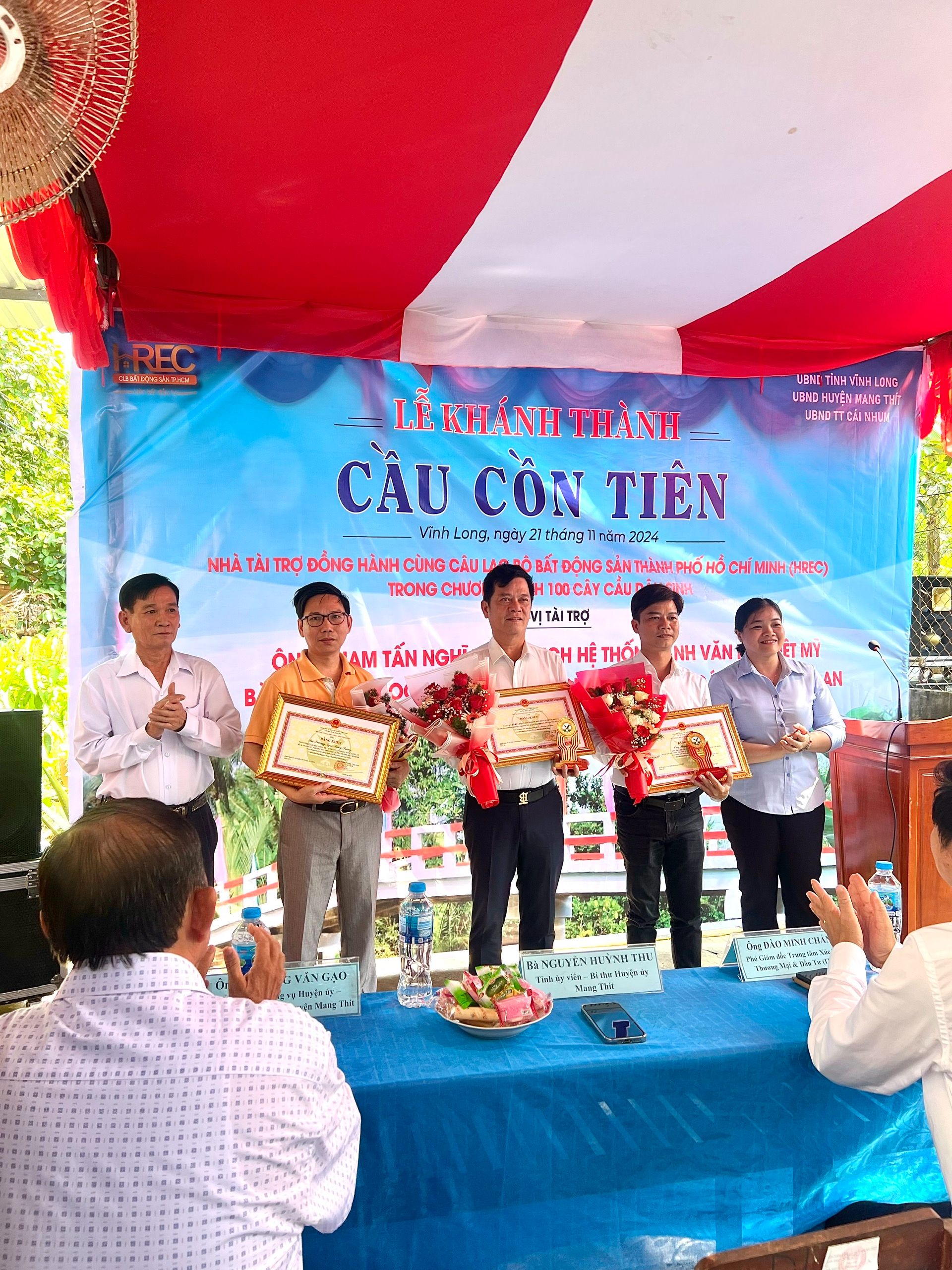 Sáng hôm nay, ngày 21/11/2024, Đoàn Câu lạc bộ Bất động sản Thành phố Hồ Chí Minh (HREC) đã tổ chức “KHÁNH THÀNH CẦU CỒN TIÊN TẠI HUYỆN MANG THÍT, TỈNH VĨNH LONG”, nhằm góp phần hoàn thiện và đáp ứng nhu cầu đi lại, giao thương của bà con trong vùng, đảm bảo an toàn giao thông và đóng góp 1 phần vào việc tạo động lực thúc đẩy kinh tế - xã hội của địa phương nói riêng và khu vực xung quanh nói chung ngày một phát triển.