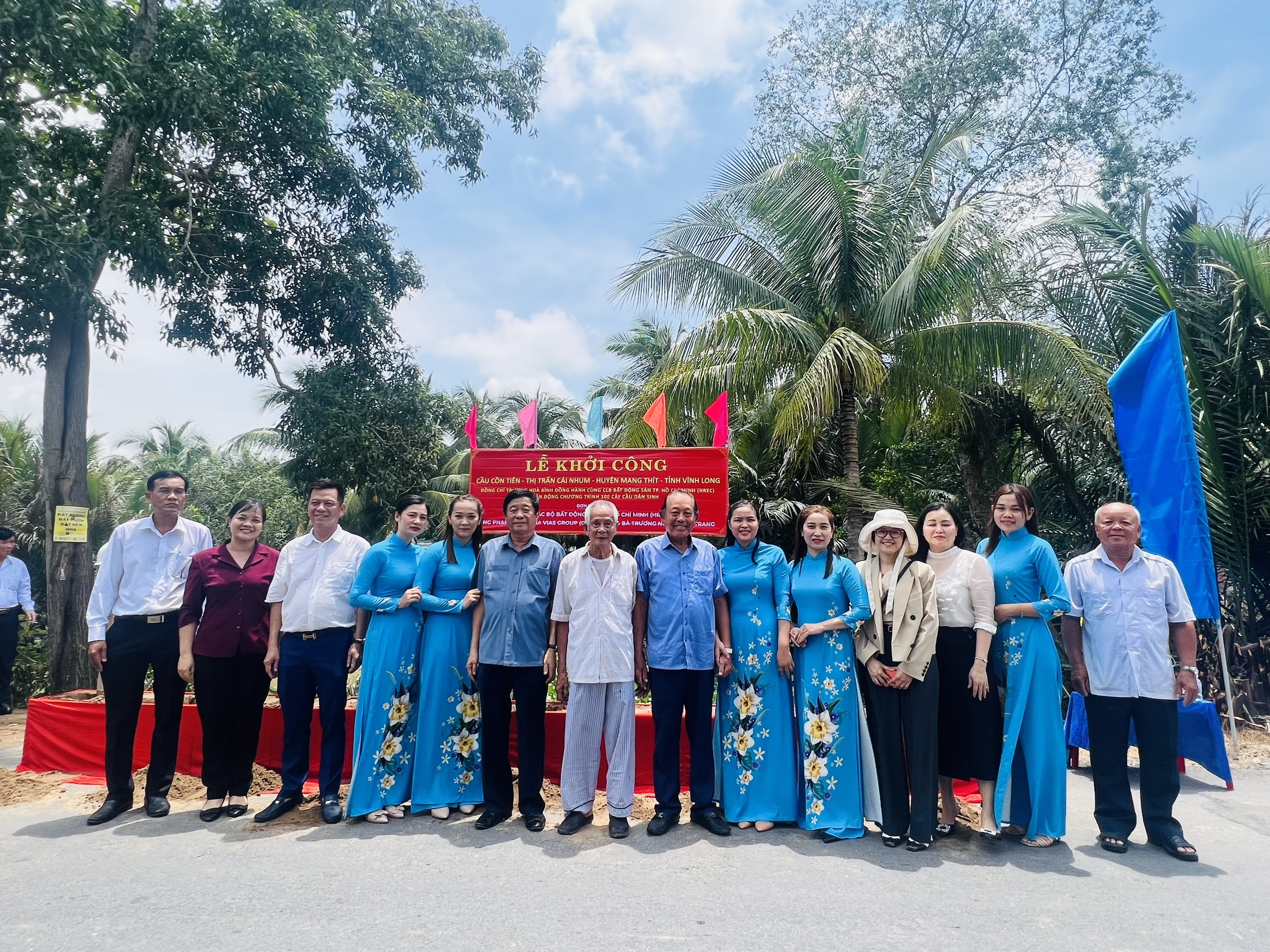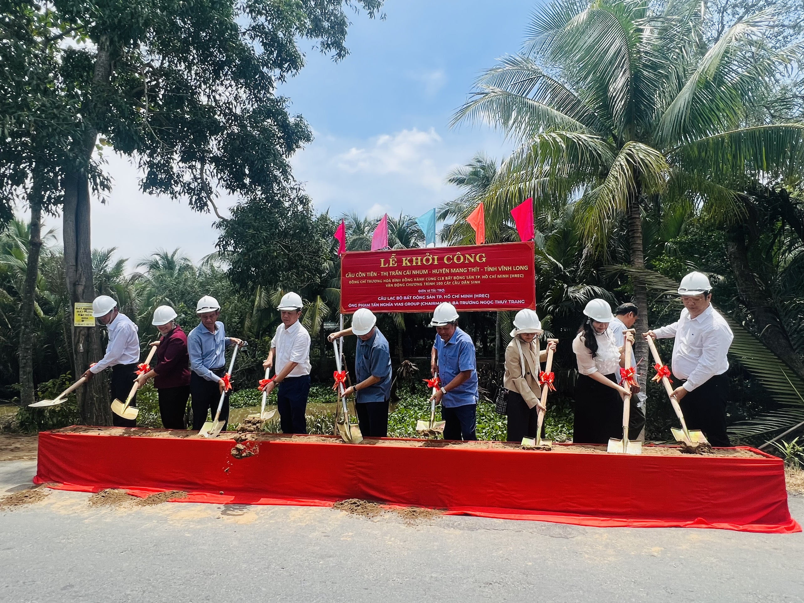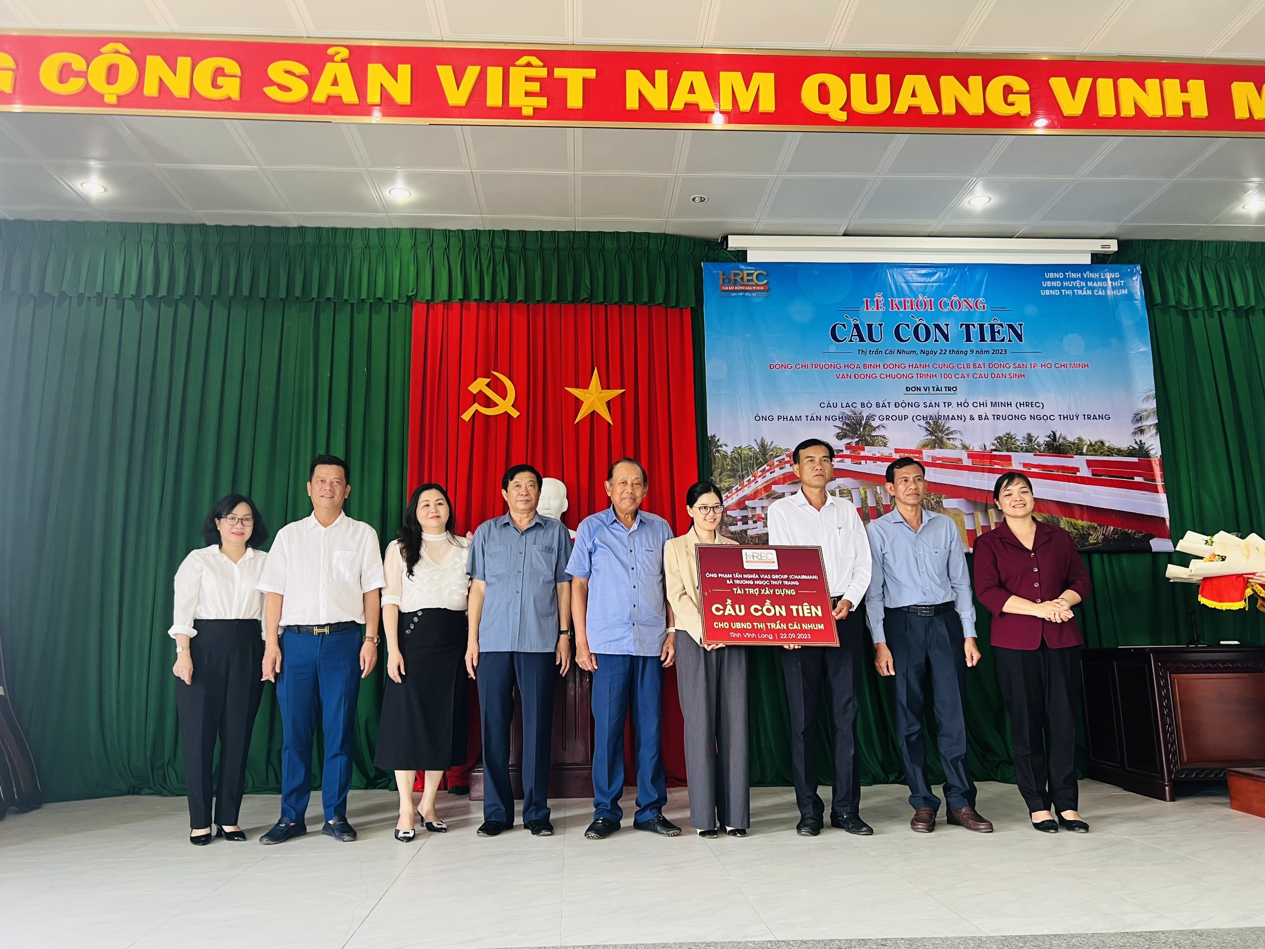 Ông Nguyễn Quốc Bảo - Chủ tịch Câu lạc bộ Bất Động Sản TP.HCM cùng Bà Hồ Thị Ánh Nga đại diện Vias group & Bà Trương Ngọc Thùy Trang Phó tổng giám đốc Công ty Cổ phần Cấp thoát nước Long An trao tặng bảng tượng trưng Cầu Cồn Tiên cho UBND Thị Trấn Cái Nhum được sự chứng kiến của đồng chí Trương Hoà Bình - Nguyên Ủy viên Bộ Chính Trị - Nguyên Phó Thủ Tướng Thường Trực Chính Phủ Nước CHXHCN VN cùng toàn thể các lãnh đạo, doanh nhân và bà con tại Thị Trấn Cái Nhum, huyện Mang Thít, tỉnh Vĩnh Long.