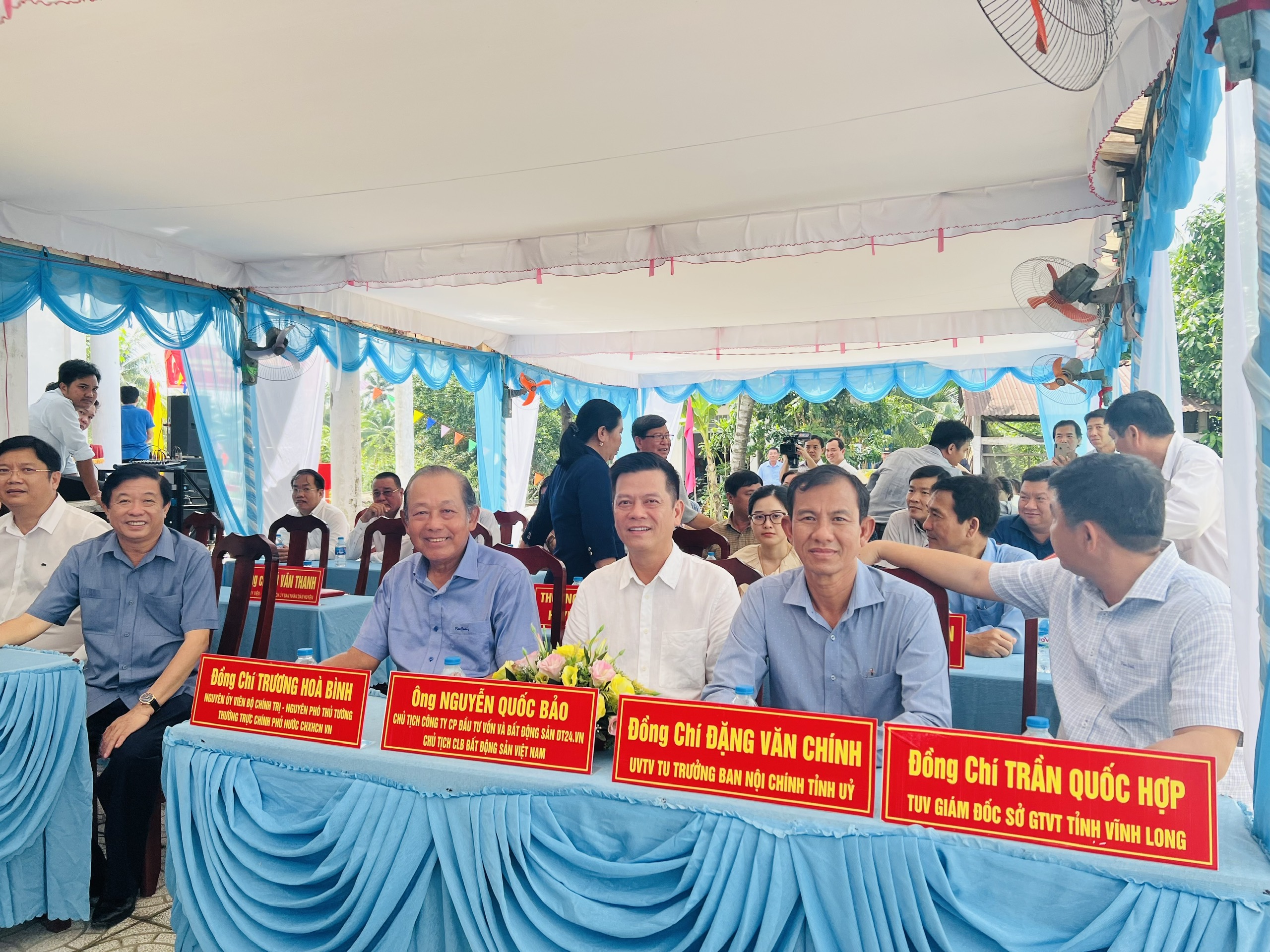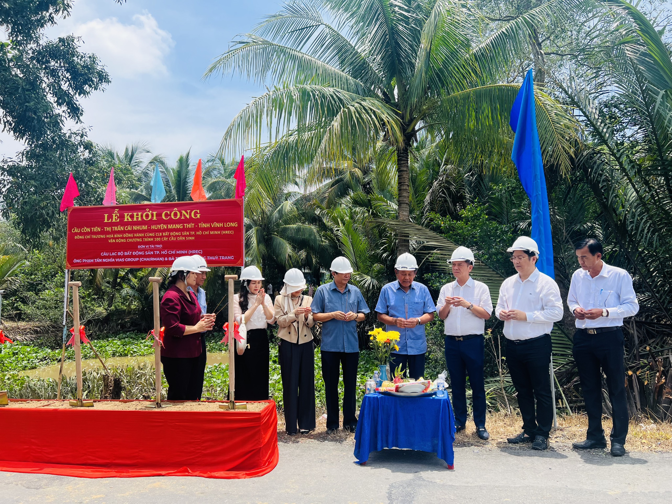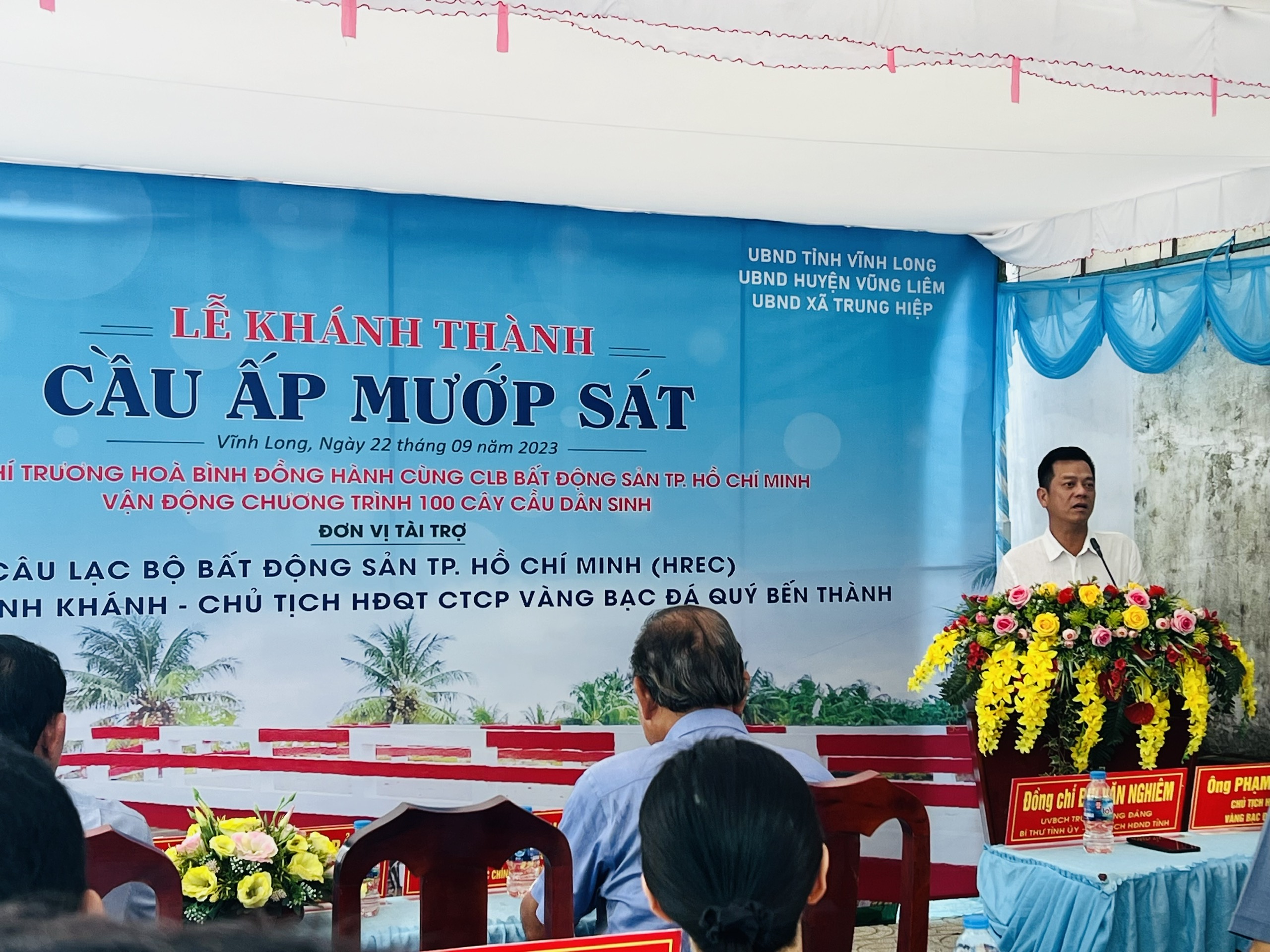 Ông Nguyễn Quốc Bảo - Chủ tịch Câu lạc bộ Bất Động Sản TP.HCM cùng Bà Hồ Thị Ánh Nga đại diện Vias group & Bà Trương Ngọc Thùy Trang Phó tổng giám đốc Công ty Cổ phần Cấp thoát nước Long An trao tặng bảng tượng trưng Cầu Cồn Tiên cho UBND Thị Trấn Cái Nhum được sự chứng kiến của đồng chí Trương Hoà Bình - Nguyên Ủy viên Bộ Chính Trị - Nguyên Phó Thủ Tướng Thường Trực Chính Phủ Nước CHXHCN VN cùng toàn thể các lãnh đạo, doanh nhân và bà con tại Thị Trấn Cái Nhum, huyện Mang Thít, tỉnh Vĩnh Long.