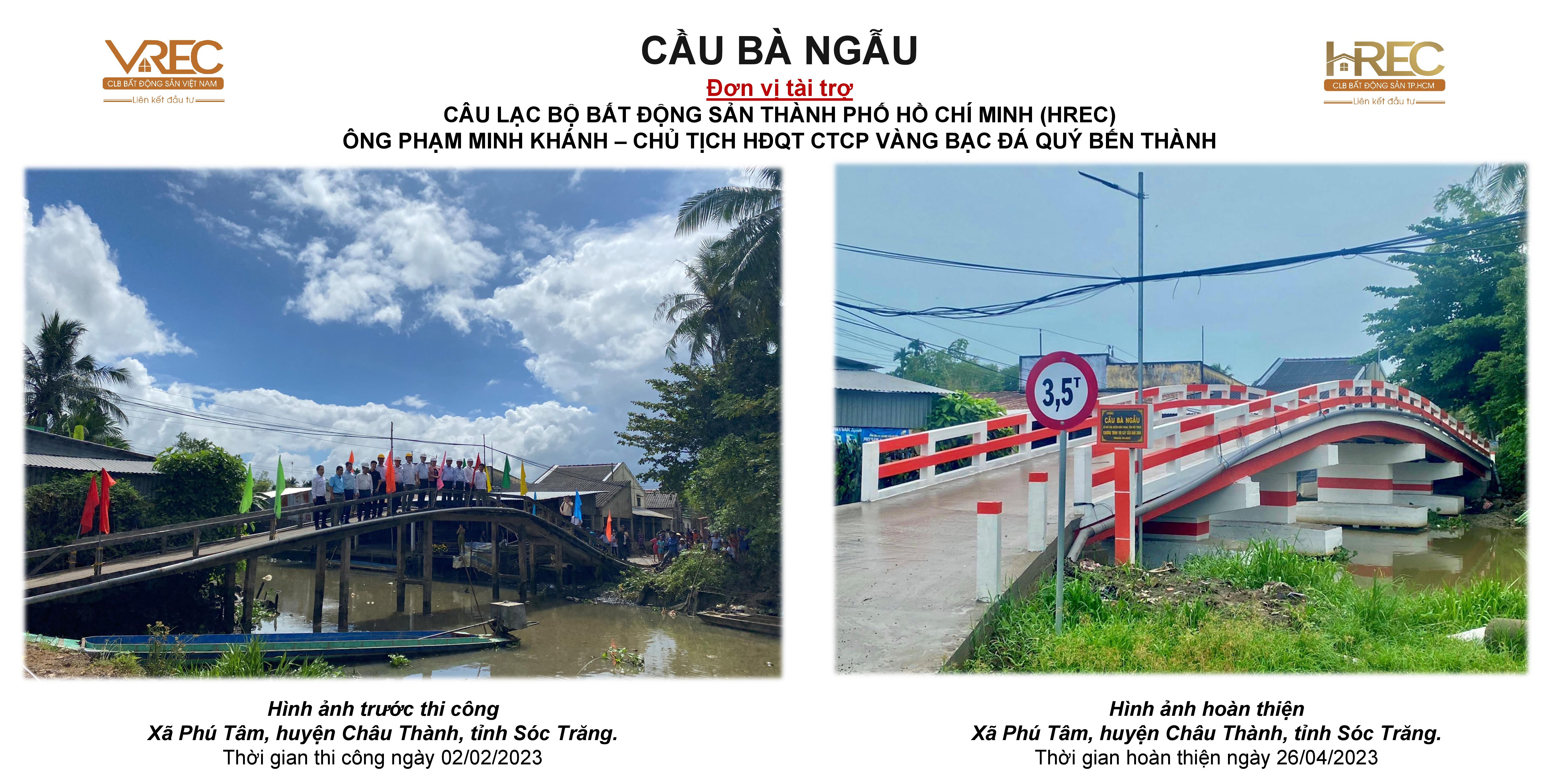 Qua hơn 3 tháng xây dựng, Cầu Bà Ngẫu đến nay đã hoàn thiện và sẵn sàng đưa vào sử dụng. Công trình Cầu Bà Ngẫu được xây dựng với thiết kế chiều dài 48m, chiều ngang 3,5m, tải trọng 3,5 tấn đáp ứng hơn 300 hộ dân nối dài 2 Xã Phú Tâm & Phú Tân, huyện Châu Thành, tỉnh Sóc Trăng. Kinh phí xây dựng hoàn thiện công trình là gần 1 tỷ đồng, được sự vận động đồng chí Trương Hoà Bình – Nguyên Uỷ viên Bộ Chính Trị - Nguyên Phó Thủ Tướng Thường Trực Chính Phủ Nước CHXHCN VN, đơn vị tài trợ Câu lạc bộ Bất Động Sản TP.HCM (HREC) & Ông Phạm Minh Khánh – Chủ tịch HĐQT CTCP Vàng Bạc Đá Quý Bến Thành.