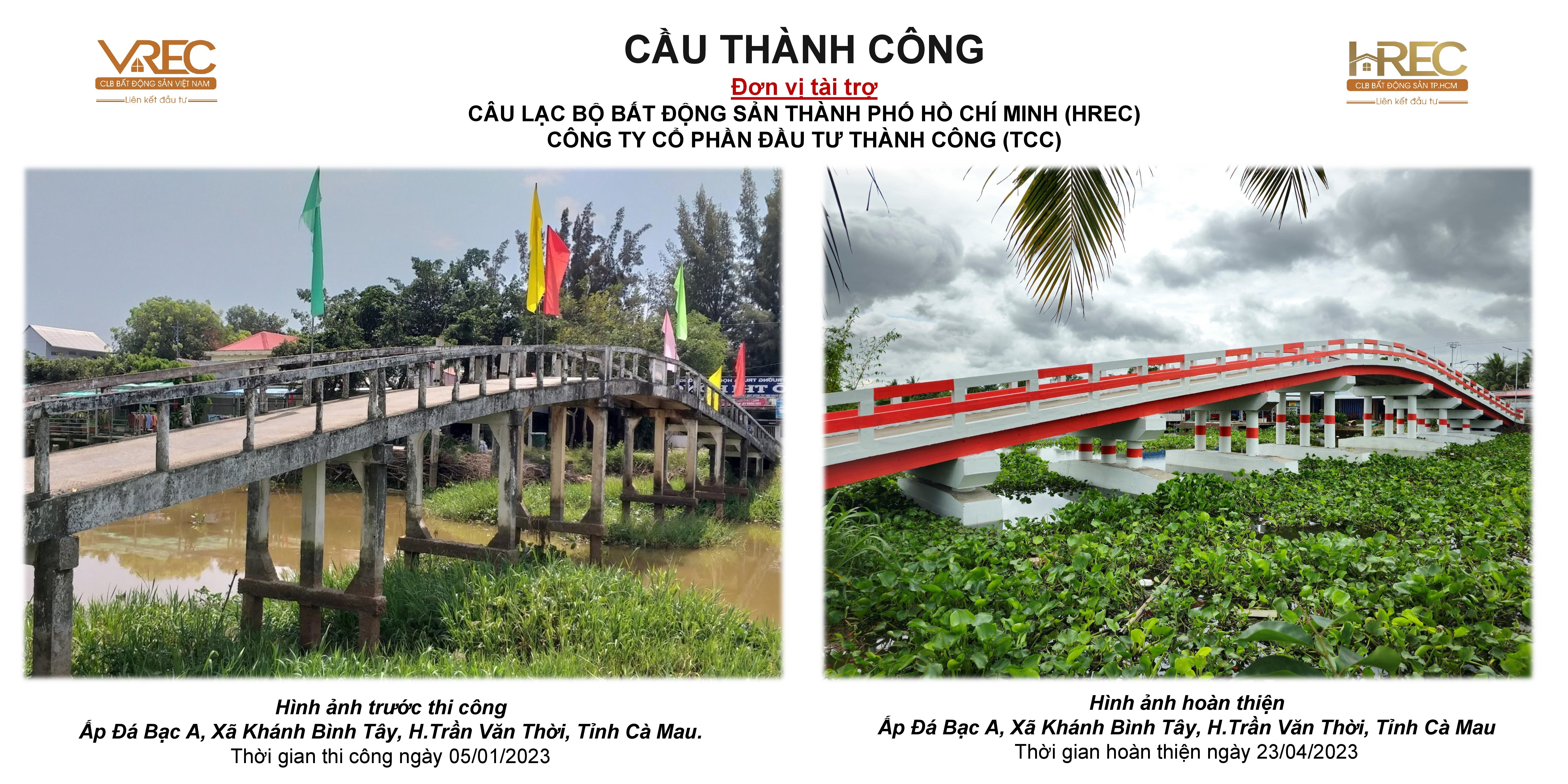 Sáng 11.06.2023, Đoàn Câu lạc bộ Bất động sản Hồ Chí Minh (HREC) đã tổ chức “LỄ KHÁNH THÀNH CẦU THÀNH CÔNG TẠI HUYỆN TRẦN VĂN THỜI TỈNH CÀ MAU” xây dựng thêm các cây cầu dân sinh tại nông thôn, nhằm góp phần hoàn thiện và đáp ứng nhu cầu đi lại, giao thương của bà con trong vùng, đảm bảo an toàn giao thông mà còn góp phần quan trọng trong việc tạo động lực thúc đẩy kinh tế-xã hội của xã nhà nói riêng và khu vực xung quanh nói chung ngày một phát triển.