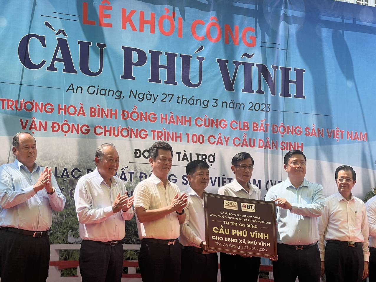 Ông Nguyễn Quốc Bảo - Chủ tịch Câu lạc bộ Bất Động Sản Việt Nam cùng Ông Phạm Minh Khánh trao tặng bảng tượng trưng Cầu Phú Vĩnh cho UBND Xã Phú Vĩnh được sự chứng kiến của đồng chí Trương Hoà Bình - Nguyên Ủy viên Bộ Chính Trị - Nguyên Phó Thủ Tướng Thường Trực Chính Phủ Nước CHXHCN VN cùng toàn thể các lãnh đạo, doanh nhân và bà con tại xã Phú Vĩnh, thị xã Tân Châu, tỉnh An Giang