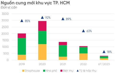 Về phân khúc nhà đất tại TP. HCM, với những khó khăn việc gọi vốn để phát triển dự án bất động sản, thâu tóm quỹ đất và hoàn thành thủ tục pháp lý, hầu như không có dự án biệt thự hay nhà phố nào mới từ các chủ đầu tư. Có nhịp hồi phục trong quý 2/2023 khi nguồn cung bắt đầu ra thị trường khi các dự án đã hoàn thiện quy trình pháp lý, bắt đầu xây dựng trở lại. Các sản phẩm được chào bán mới trên thị trường đến từ các dự án tồn đọng trước đó và tập trung chủ yếu tại TP. Thủ Đức.