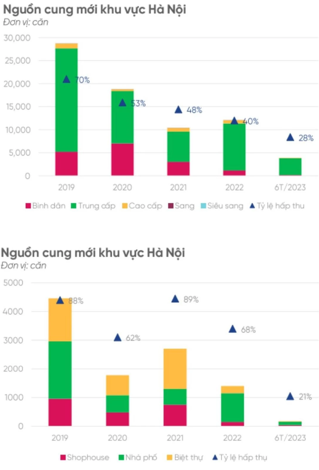 Tương tự, nguồn cung mới tại Hà Nội cũng giảm 50% so với cùng kỳ năm trước đối với căn hộ còn 3,596 căn hộ và giảm 70% đối với nhà đất còn 361 căn.