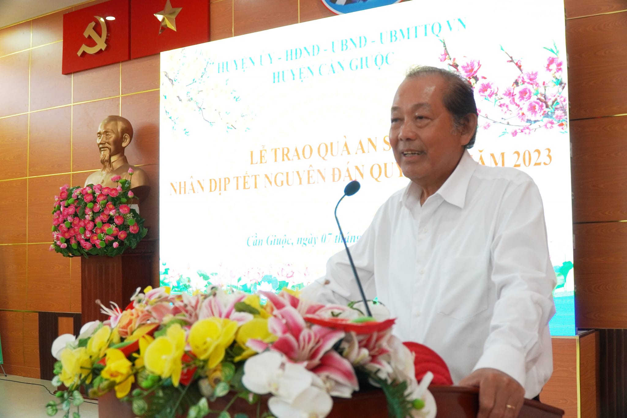 Tại buổi lễ, Bà Trương Minh Kiều – Chủ tịch UBND Quận 5, Tp.HCM và Công ty (Cty) sữa VP Milk đã hỗ trợ, trao tặng 200 phần quà, mỗi phần trị giá 1.000.000 đồng, Cty dầu khí hóa chất Đông Nam trao 300 phần quà trị giá 240.000.000 đồng, Cty TNHH MTV Kỹ thuật – Xây dựng – Môi trường Nhật Nam tặng 115 thẻ BHYT cho gia đình chính sách, hộ nghèo, hộ có hoàn cảnh khó khăn và lực lượng nồng cốt trên địa bàn huyện. Bí thư Huyện ủy Cần Giuộc - Trương Thanh Liêm cho biết: “Thời gian qua, Đảng bộ, Chính quyền và Nhân dân huyện Cần Giuộc đã có nhiều nỗ lực trong việc chăm lo phát triển kinh tế - xã hội, từng bước nâng cao đời sống của Nhân dân. Tuy nhiên do ngân sách của huyện còn hạn chế, sự quan tâm, chia sẻ của các tổ chức, cá nhân trong và ngoài nguyện là rất ý nghĩa và đáng trân trọng. Đồng chí Bí thư Huyện ủy cảm ơn sự đồng hành, chia sẻ của các doanh nghiệp, tổ chức, cá nhân trong thời gian qua đã cùng với địa phương thực hiện tốt công tác an sinh xã hội cũng như các hoạt động phát triển kinh tế xã hội. Trước thềm năm mới, đồng chí chúc các gia đình đón tết vui tươi, đầm ấm, tiếp tục phát triển kinh tế gia đình, từng bước vươn lên ổn định cuộc sống. Dịp này, hội doanh nhân trẻ tỉnh Long An, chi hội doanh nhân trẻ huyện Cần Giuộc hỗ trợ 250.000.000 đồng, CTCP vàng bạc đá quý Bến Thành hỗ trợ 200.000.000 đồng, Công ty cổ phần Long Hậu hỗ trợ 100.00.000 đồng, CTCP môi trường Tân Thiên Nhiên, Công ty xây dựng Hưởng Thanh Bình, Công ty khai thác và quản lý khu công nghiệp Đặng Huỳnh, Ngân hàng Agribank chi nhánh đông Long An, nhóm doanh nghiệp nhựa Phước Lý hỗ trợ tổng số tiền 250.000.000 đồng để chăm lo cho các đối tượng nhân dịp Xuân Quý Mão 2023.