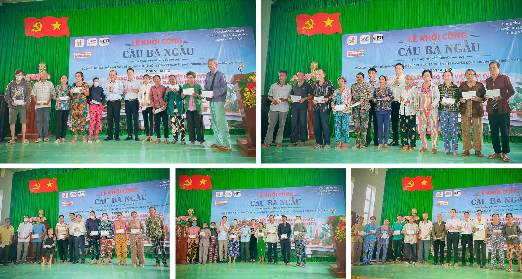 Đại diện Đoàn Câu Lạc Bộ Bất Động Sản Việt Nam & Đơn vị tài trợ cho quỹ xây cầu từ thiện: Ông Nguyễn Quốc Bảo – Chủ tịch CLB Bất động sản Việt Nam – Chủ tịch Công ty CP Đầu Tư Vốn Và Bất Động Sản DT24.VN, Ông Phạm Minh Khánh – Chủ tịch HĐQT Công ty CP Vàng Bạc Đá Quý Bến Thành, Ông Phan Quang – Tổng Giám đốc Công ty Cổ phần Gạch ngói Xuân Hòa, Ông Nguyễn Văn Huy - Chủ Tịch HĐTV Công Ty TNHH Đầu Tư Địa Ốc Anh Minh, Ông Lê Bảo Toàn – Chủ tịch HĐQT CTCP ĐT TK XD Toàn Kiến Trúc Nhà Đẹp, Ông Lâm Sơn Giang – Giám đốc Công ty TNHH Khởi Tiến.