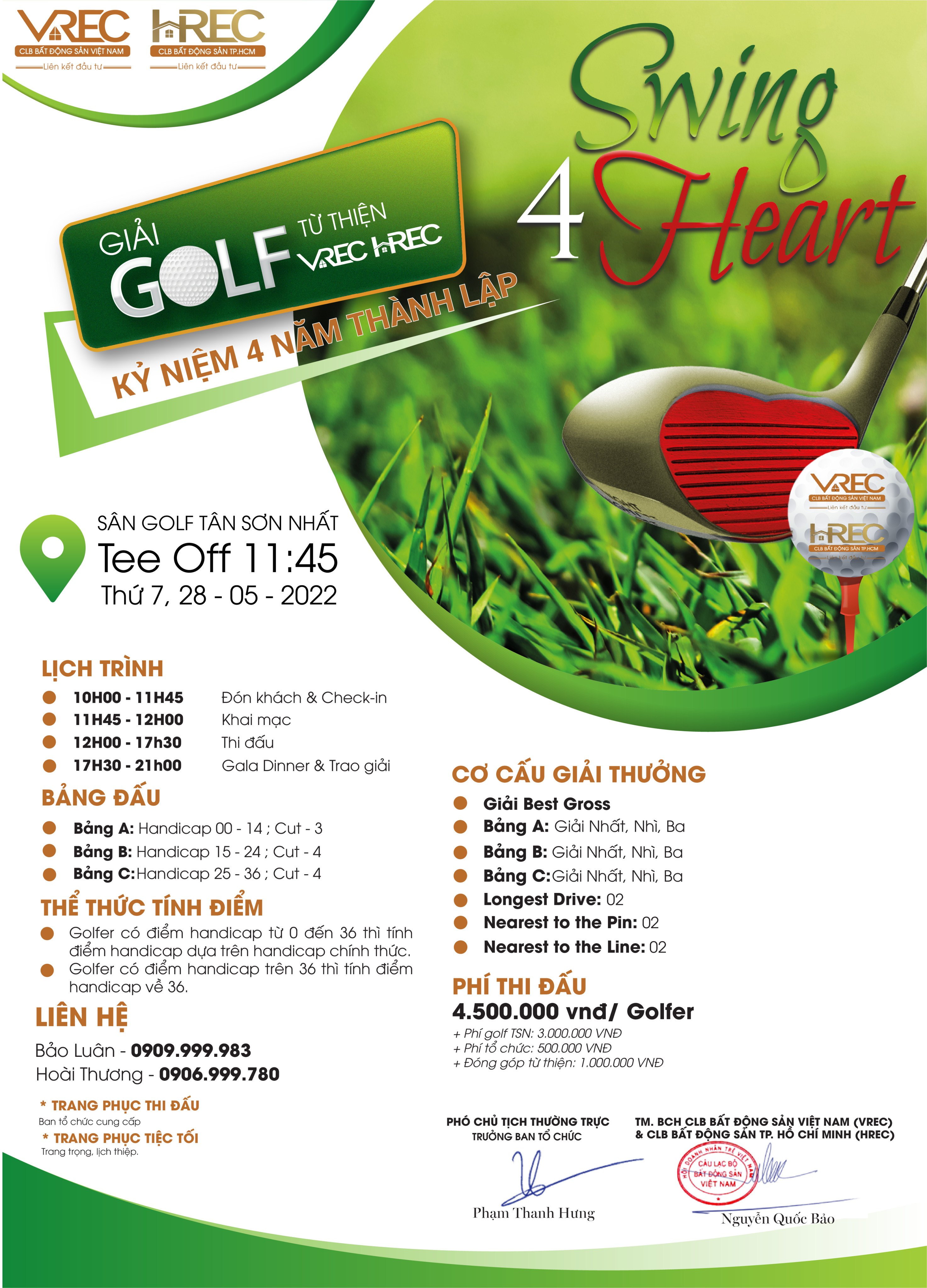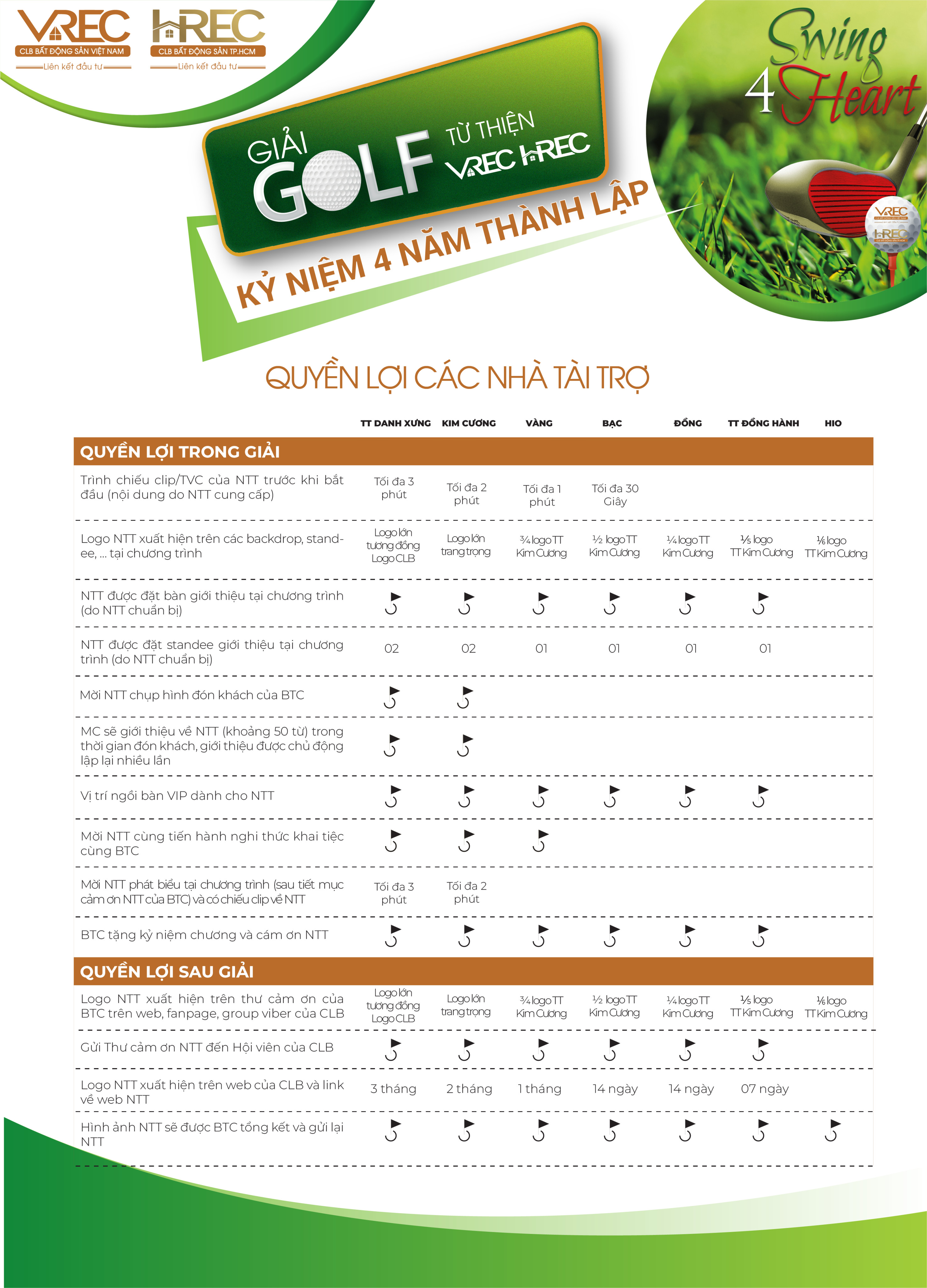 Nhân kỷ niệm 4 năm ngày thành lập, Câu Lạc Bộ Bất Động Sản Việt Nam (VREC) & Câu Lạc Bộ Bất Động Sản TP.Hồ Chí Minh (HREC) chính thức tổ chức Chương trình “KẾT SỨC MẠNH - NỐI THÀNH CÔNG” đây cũng là chủ đề chính của “VREC & HREC KỶ NIỆM 4 NĂM THÀNH LẬP” đồng thời tổ chức “GIẢI GOLF TỪ THIỆN VREC & HREC KỶ NIỆM 4 NĂM THÀNH LẬP” với chủ đề “SWING 4 HEART” tạo tinh thần Đoàn kết – Ấm áp – Thiết thực với mong muốn gắn kết tình thân Quý Hội viên và Quý Đối tác.