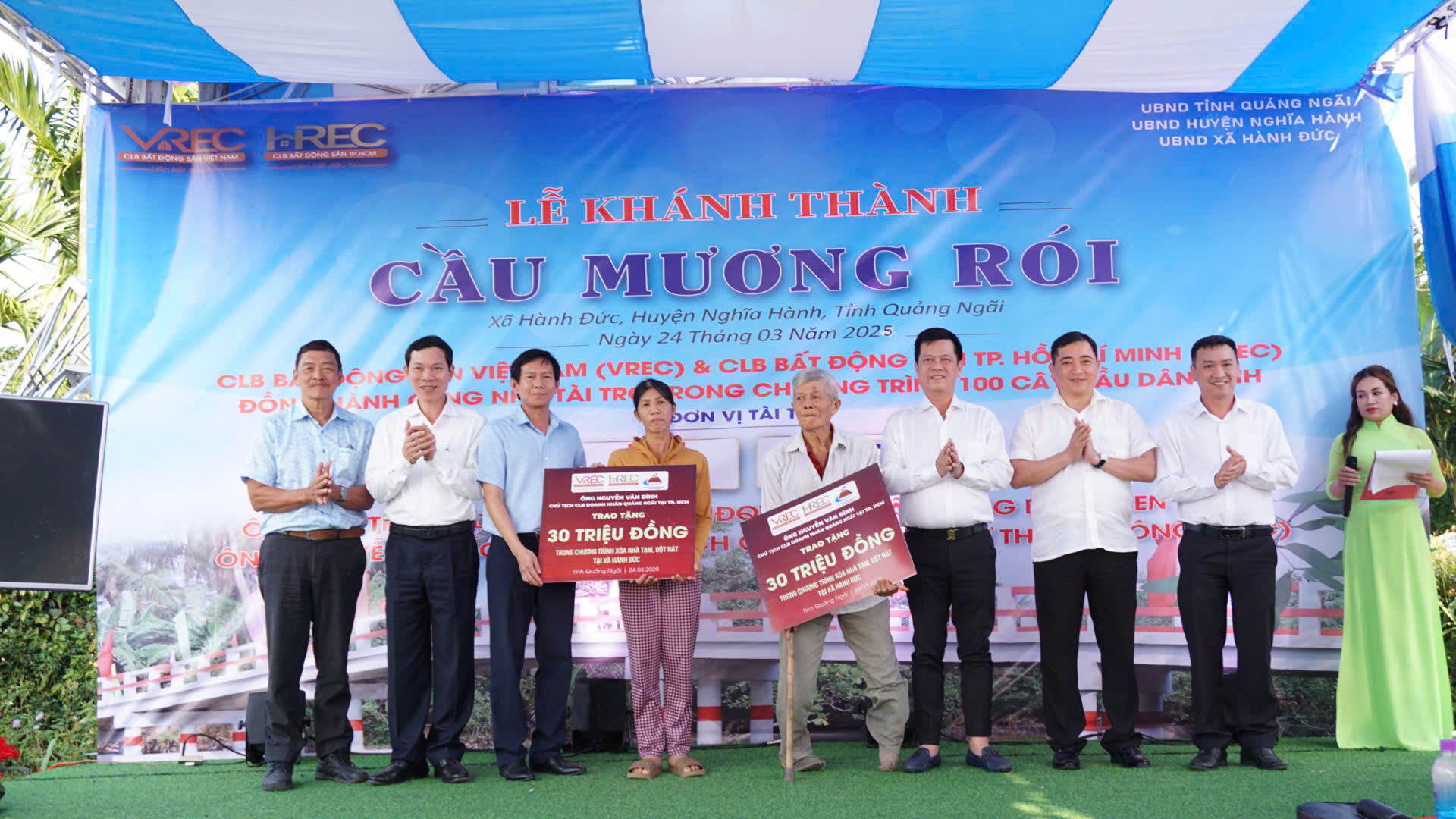 Chiều hôm nay, Đoàn Câu lạc bộ Bất động sản Việt Nam (VREC) và Câu lạc bộ Bất động sản TP. Hồ Chí Minh (HREC) đã tổ chức “KHÁNH THÀNH CẦU MƯƠNG RÓI TẠI XÃ HÀNH ĐỨC, HUYỆN NGHĨA HÀNH, TỈNH QUẢNG NGÃI”, nhằm góp phần hoàn thiện và đáp ứng nhu cầu đi lại, giao thương của bà con trong vùng, đảm bảo an toàn giao thông mà còn góp phần quan trọng trong việc tạo động lực thúc đẩy kinh tế-xã hội của xã nhà nói riêng và khu vực xung quanh nói chung ngày một phát triển.