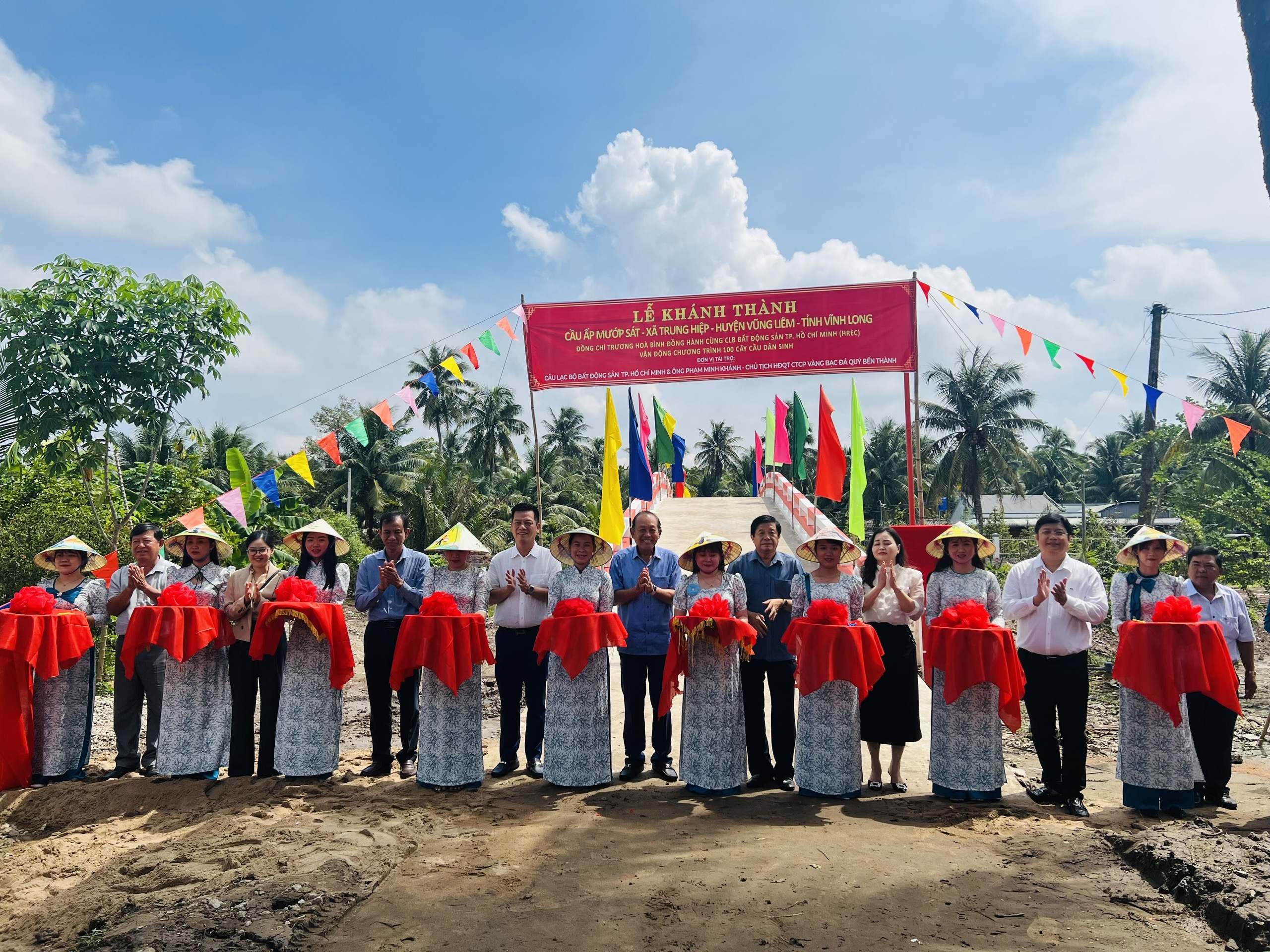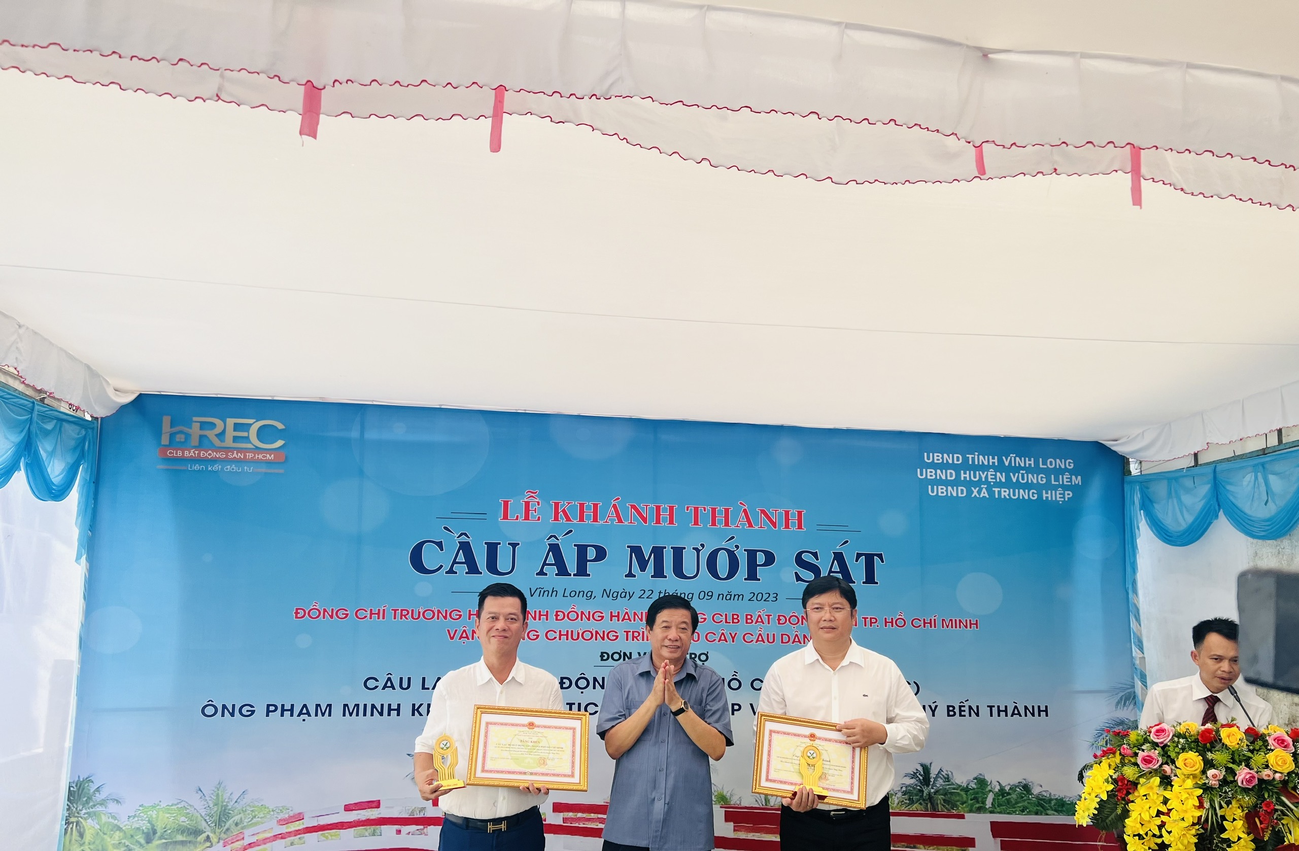 Sáng nay ngày 22.09.2023, Đoàn Câu lạc bộ Bất động sản Hồ Chí Minh (HREC) đã tổ chức “KHÁNH THÀNH CẦU ẤP MƯỚP SÁT & KHỞI CÔNG CẦU CỒN TIÊN TẠI 2 HUYỆN VŨNG LIÊM & HUYỆN MANG THÍT TỈNH VĨNH LONG” xây dựng thêm các cây cầu dân sinh tại nông thôn, nhằm góp phần hoàn thiện và đáp ứng nhu cầu đi lại, giao thương của bà con trong vùng, đảm bảo an toàn giao thông mà còn góp phần quan trọng trong việc tạo động lực thúc đẩy kinh tế-xã hội của xã nhà nói riêng và khu vực xung quanh nói chung ngày một phát triển.
