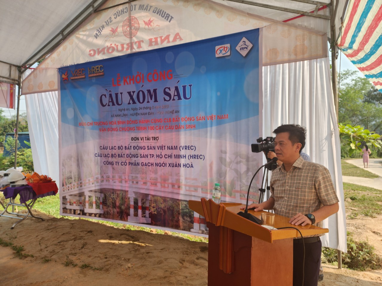 Chia sẻ tại buổi lễ Khởi Công, Ông Nguyễn Quốc Bảo - Chủ tịch Câu lạc bộ Bất Động Sản Việt Nam chia sẻ: “Hoạt động xây cầu từ thiện là chương trình đầy tâm huyết của VREC & HREC với tôn chỉ “Kết nối bờ vui”. Chúng tôi hiểu được giao thông liên lạc, thuận tiện thì giao thương mới phát triển, bà con yên tâm đi lại, trẻ em an toàn đến trường. Hiện trạng cơ sở hạ tầng ở nông thôn khác xa ở thành thị và kết nối đôi bờ cũng như kết nối những giấc mơ còn dang dở, nhiều cây cầu sau khi hoàn thành trong thời gian ngắn giúp người dân kết nối đôi bờ nhằm phát triển kinh tế địa phương nói riêng và phát triển tỉnh Nghệ An nói chung”.