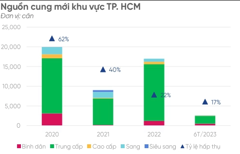 VPBankS dự kiến, trong nửa cuối năm 2023, tại TP. HCM có khoảng 8.450 căn được mở bán. Trong đó, phân khúc trung cấp chiếm 54%, bình dân chiếm 39% và cao cấp trở lên chiếm 7%.