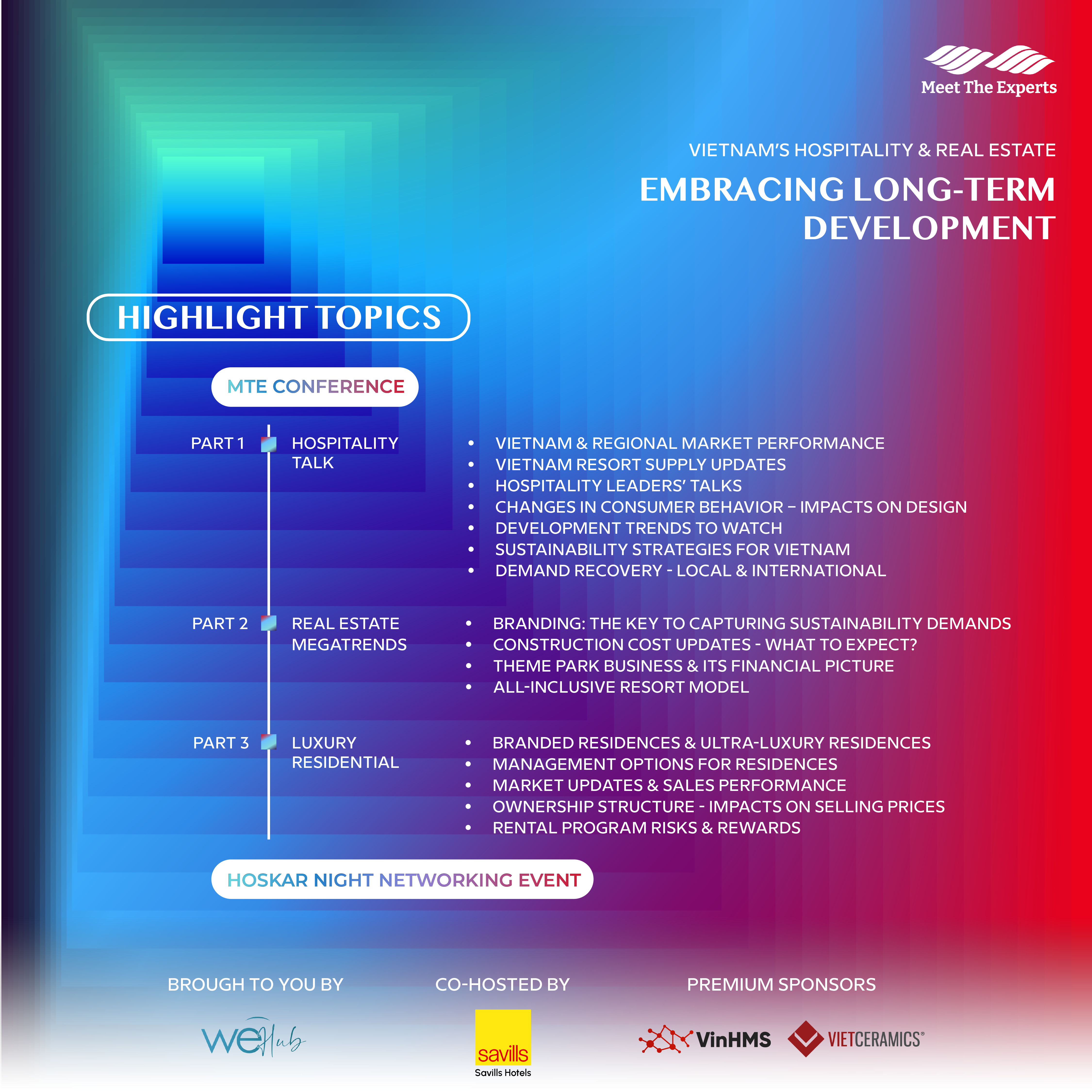 Co-hosted by Savills Hotels [Please keep the text “Savills Hotels”], with more than 20 leading speakers, the MTE conference will present the latest real estate & hospitality market insights, trendy & exciting topics, and the renowned HoSkar Night networking event after the conference.